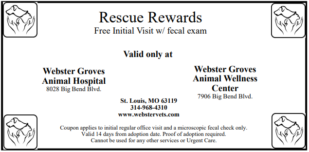 We are offering a special reward for our caring clients who provide loving homes for rescued, homeless animals. Click the image to open your Rescue Rewards coupon. Please print the coupon and bring it to your new pet’s first visit!